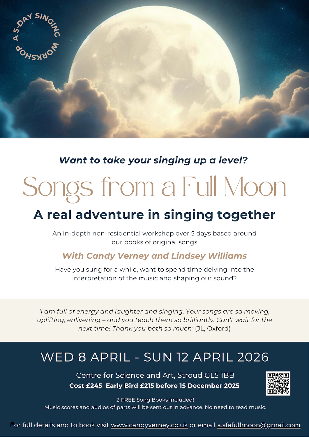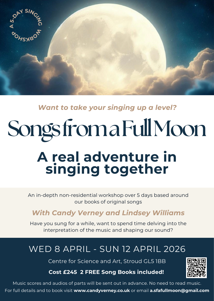 In Spring 2026 Candy and her colleague and friend, Lindsey Williams, will be running a 5-day non-residential singing workshop in Stroud, UK based on their songbook ‘Songs from a Full Moon’ and Candy’s ‘A Book of Irish Songs for Choirs’.